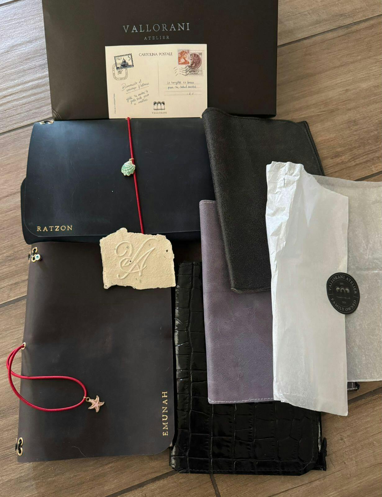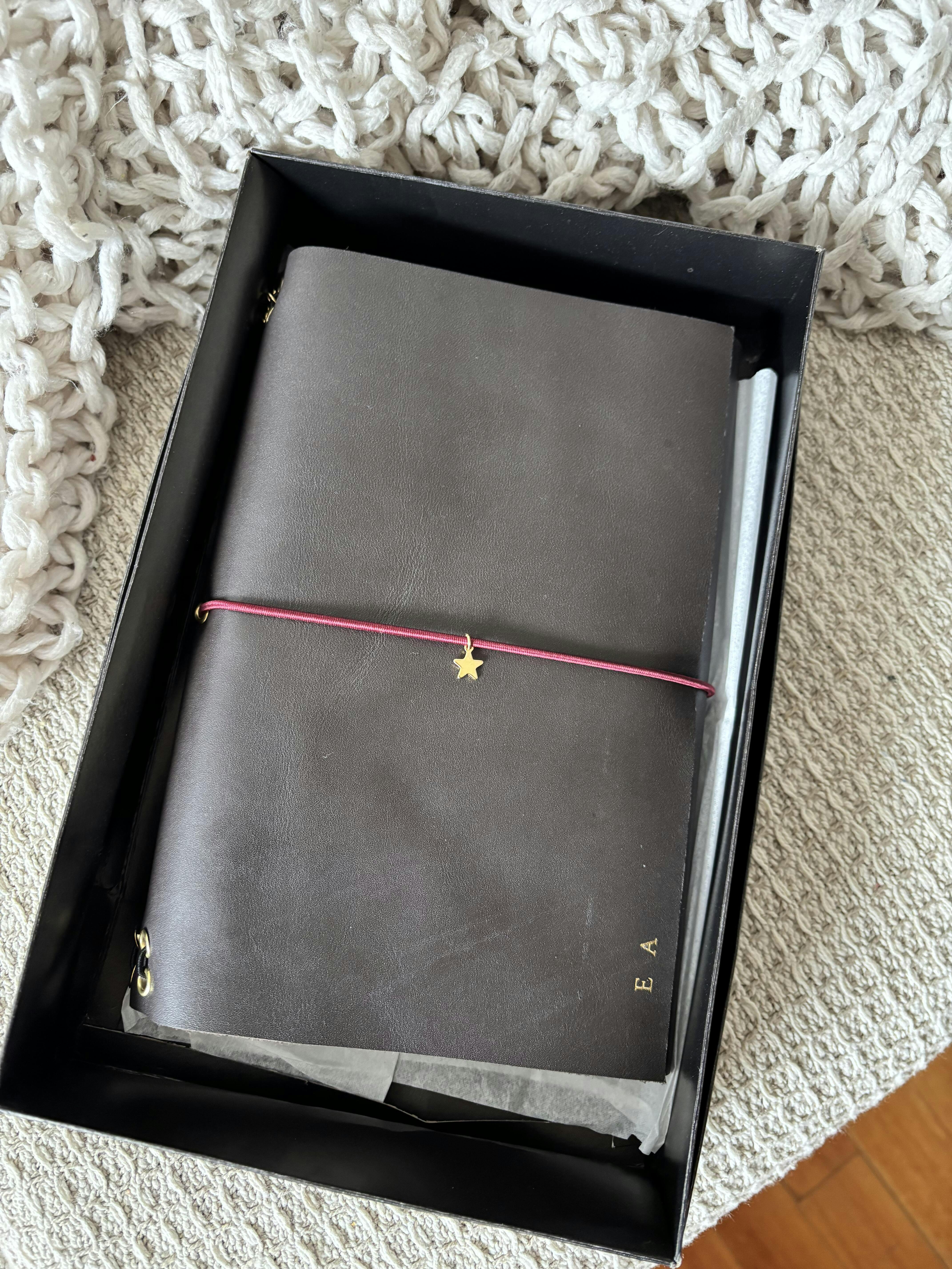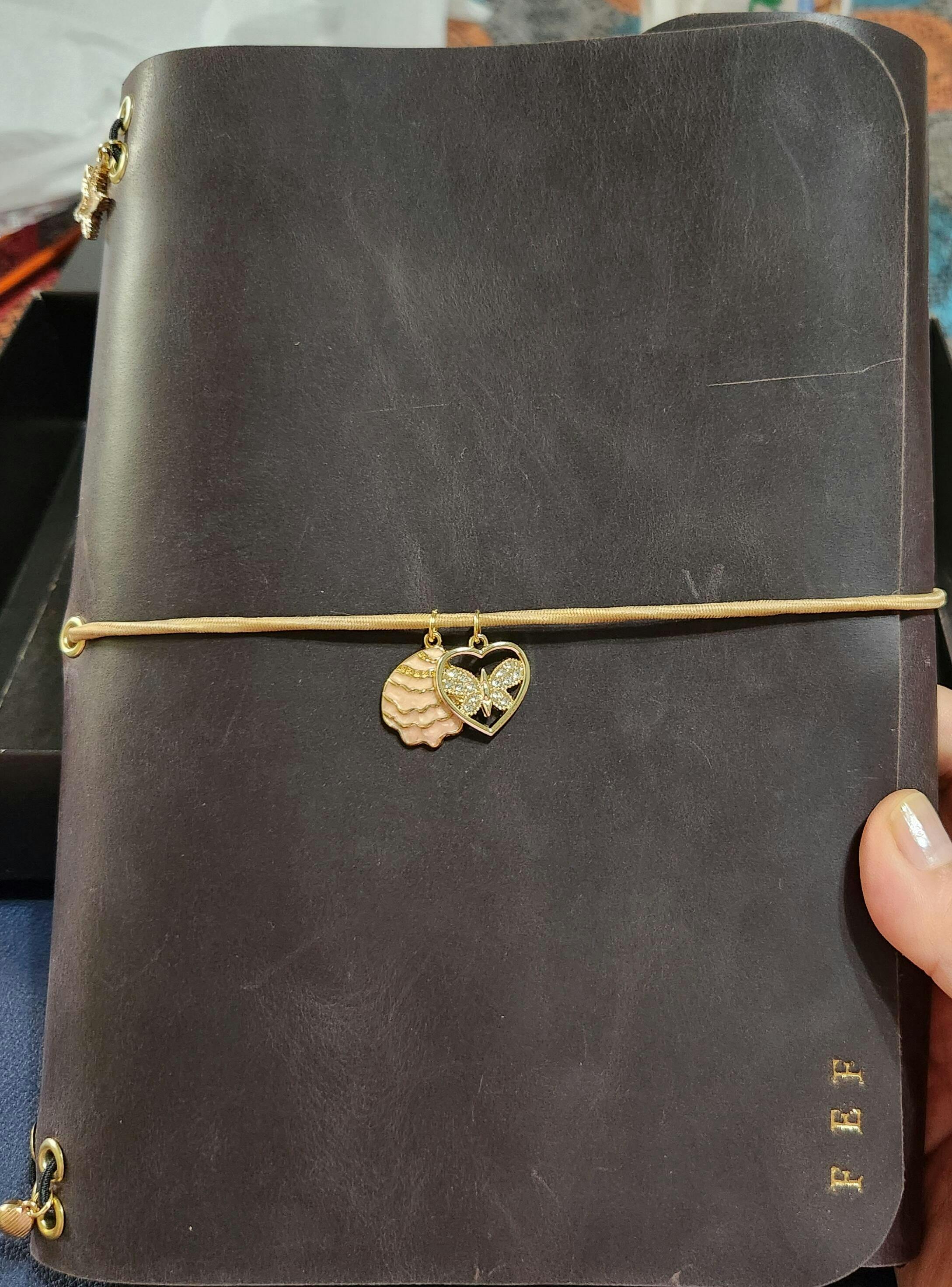 2 charms (1 frente & 1 lateral), grabado en el frente y 2 cuadernos interiores tamaño A5 punteados (30 hojas cada uno, kraft).
